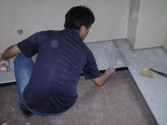 4、鋪貼時,水泥砂漿應(yīng)飽滿地抹在陶瓷地面磚背面,鋪貼后用橡皮棰敲實。同時,用水平尺檢查校正,擦凈表面水泥砂漿。