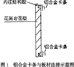 石材施工工藝流程為:定板材的尺寸---對板材進(jìn)行開槽---注膠前清潔---用結(jié)構(gòu)膠將掛件與花崗巖板材粘結(jié)(如圖1所示)---結(jié)構(gòu)膠固化---板面清理---板塊排版。