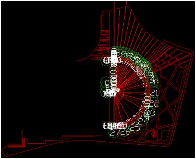 2、在建立軸網(wǎng)時(shí),因景觀類工程一般沒(méi)有標(biāo)準(zhǔn)的縱橫軸線和軸線標(biāo)識(shí),所以需要充分利用已有的電子版CAD圖。在識(shí)別CAD圖時(shí),可以把主要畫圖要用到的定位線作為軸線提取,如硬質(zhì)鋪裝和綠化邊線、人行道路沿線、林蔭步道的邊線、臺(tái)階邊線等;把其他需要輔助畫圖的線作為軸線標(biāo)識(shí)提取,如綠化盲溝線、雨污水井邊線等??傊M可能地多導(dǎo)入CAD圖里面的線條元素。本工程導(dǎo)入CAD后如圖: