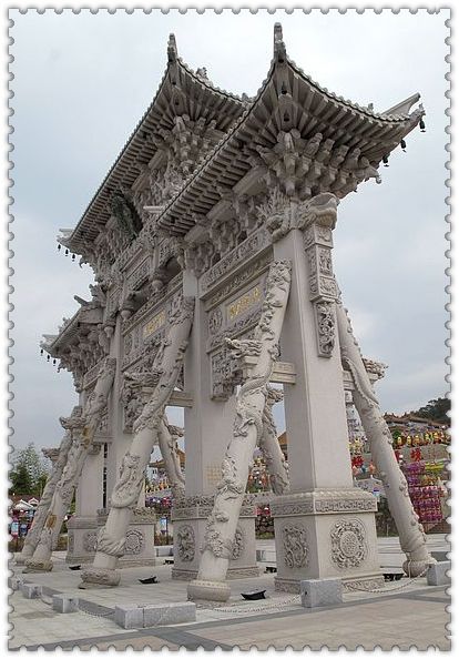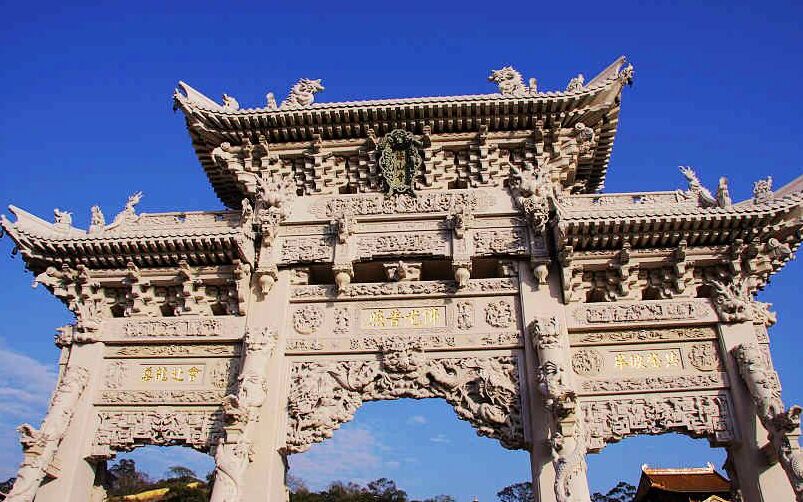 整座山門造型獨特,兩側(cè)護衛(wèi)山門的八根特殊龍柱,又稱“福賜八大龍金剛”,與山門形成穩(wěn)固的三角形,這在全國的石質(zhì)山門中絕無僅有。支撐山門的其他柱子則采用了多重疊加方式,先垂直后倒掛,遍布整座山門有100多條龍,象征著富貴和吉祥。據(jù)報載山門的修建請來了近60名一流的福建惠安石雕師傅,前后耗時3年,耗資1000萬元左右。