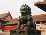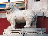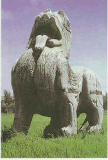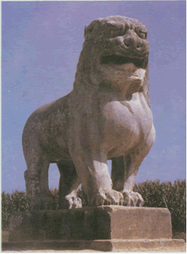 南北朝時(shí)期,墓前雕像有所恢復(fù),一般都在墓前設(shè)置一對或多對石獸。這種悖常為“神獸”的想象中動物形象,被成為“麒麟”,有的似獅虎,卻右翼,被稱為“避邪”。這種石雕一般都比較龐大,姿態(tài)宏偉,整體感較強(qiáng),又較為濃厚的漢代遺風(fēng)?,F(xiàn)存遺跡多為南北朝時(shí)作品,江蘇南京周邊比較多見。其中最為杰出的是江蘇句容石獅村梁南康簡王蕭績墓前的石雕群,造型簡潔,體積感強(qiáng),最能代表當(dāng)時(shí)的藝術(shù)風(fēng)格。