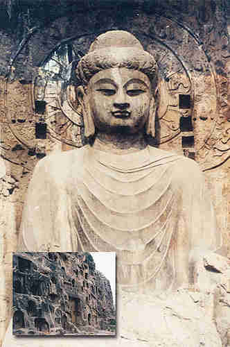 河南洛陽城南的龍門石窟,力經(jīng)東魏、北齊、隋、唐多個(gè)朝代之開鑿,作品龐雜,遺留作品也較多??上У氖?解放前被外國列強(qiáng)盜去了許多造像以及頭、手臂等局部,造成了無法挽回的損失。賓陽中洞是龍門石窟中比較重要的一處,是北朝時(shí)期有史實(shí)可查的,其形制結(jié)構(gòu)與云岡曇曜五窟相似,窟內(nèi)飾有蓮花、飛天、云氣等圖案,氣氛神秘、紋飾華麗,但無瑣碎之感;蓮花洞內(nèi)的石雕蓮花特別突出,窟內(nèi)主佛像為站立姿勢,手臂的雕刻尤為動人,,似有柔軟彈性之感;古陽洞是龍門石窟中較大的一個(gè),歷史年代也較早,最有代表性的是在洞內(nèi)壁面上雕滿了小佛龕,幾乎每龕都有造像題記,中國著名的書法碑帖“龍門二十品”中,古陽洞中的就有十九品。