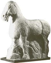 雖然在整個(gè)雕塑史中,秦代只占據(jù)著短短的十五年,但只一個(gè)兵馬俑的出現(xiàn),就足以改變中國雕塑史。它出土于1974-1976年,主要以兵俑和馬俑居多。體態(tài)與真人等大,數(shù)量眾多,神態(tài)各異;自是有立、有跪,有馭手、射手;由軍官、士兵之分。馬俑形象寫實(shí),身材矯健,可見當(dāng)時(shí)雕塑者對生活觀察之細(xì)致、對塑造技術(shù)支精通。這些秦始皇百萬大軍的縮影都是用陶土燒制而成,不論是造型、塑造、燒制等各個(gè)環(huán)節(jié),都是一件龐大的工程。一般采用模制加手工塑型的技術(shù),分段成型,整體焙燒。其陶泥制的細(xì)膩、燒成火焰均勻、過程當(dāng)中變形較小,燒成后外表用顏料彩飾。作品注重面部形象刻畫,據(jù)說萬千兵馬俑沒有充樣、雷同的,可用“栩栩如生”這個(gè)詞來形容。從人物結(jié)構(gòu)上看,比例合適,動態(tài)自然。秦俑的單件作品都有很強(qiáng)的動作個(gè)性,有的手持利劍,有的佇立凝視,有的堅(jiān)定剛毅。但整體上不在乎細(xì)節(jié)變化,不是完全照搬現(xiàn)實(shí),在軀方頭圓上有強(qiáng)烈的體塊對比、疏密變化、動靜之別。