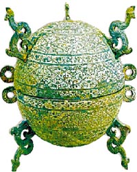 西漢的工藝裝飾性雕塑也十分發(fā)達(dá),其一為銅鏡裝飾。這一時(shí)期除了與前代大體相同的云雷紋、蟠龍紋以外,比較流行使用吉祥語,如“長相思、毋相忘、常富貴、樂未央”等等;乳釘紋也是這一時(shí)期的特點(diǎn),在乳釘之間有人物、鳥獸等等。其二,西漢的金銀嵌鑲工藝也比較發(fā)達(dá)。是在銅制器物上嵌鑲金、因、松石等不同材質(zhì)的裝飾,在填以黑漆,曰“錯(cuò)金銀”。最有代表性的一件作品為“錯(cuò)金銀”博山爐,雖微熏香用的實(shí)用品,但其爐蓋雕制成層次重疊的造型,這在漢代也十分盛行。