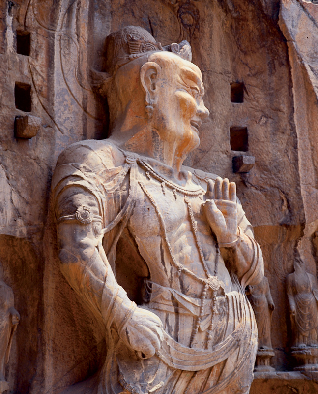 傳神是中國(guó)藝術(shù)的最高審美要求。面部表情是最能表現(xiàn)人的思想感情的,佛的莊嚴(yán)、觀音的慈祥、憤怒的天王、騾悍的力士都要通過(guò)人的眼神、嘴唇的微妙變化傳達(dá)出來(lái),當(dāng)然,眼睛離不開五官的諧和,神態(tài)也離不開身姿手勢(shì)的表征。除個(gè)體形象本身的傳神之外,傳神還表現(xiàn)在人物關(guān)系之間及巨幅造像的整體意境中。