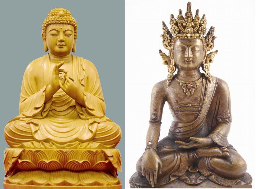 這些佛沒(méi)有太多的固定標(biāo)幟,阿彌陀佛一般是雙手重疊置膝上作禪定手印;毗盧遮那佛雙拳握抱,兩手食指相并,稱智拳印;藥師佛右手往往捻一藥丸或左手托一小缽;其他的佛作說(shuō)法印或作施無(wú)畏印。按佛經(jīng)上說(shuō),只有降魔印、說(shuō)法印、禪定印、施無(wú)畏印、與愿印等五種基本手印,各佛皆可使用。