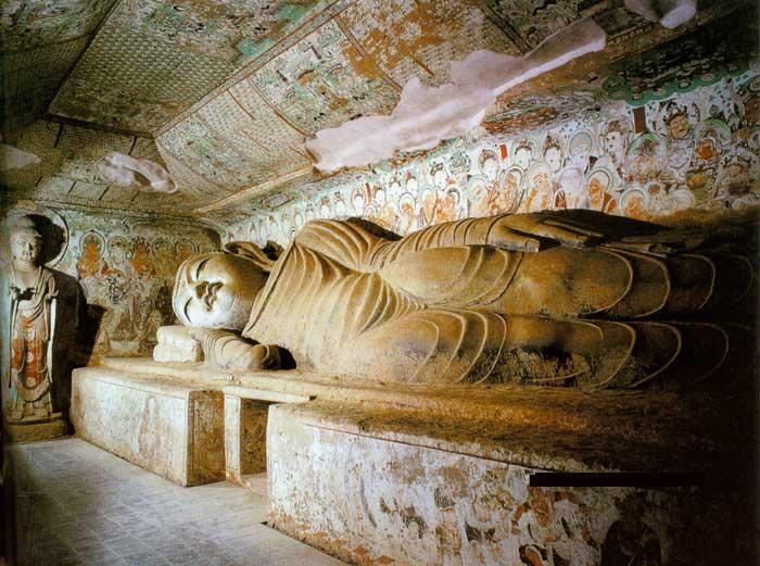 臥像一般表示釋迦佛在住世多年,最后去世涅槃時(shí)的情況。其姿態(tài)大多為右脅而臥,有的還在其身后塑繪出眾多弟子悲哀哭泣的形狀,以表現(xiàn)他們對(duì)佛涅槃的悲傷心情。