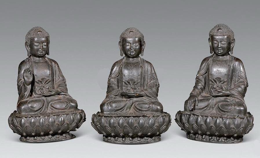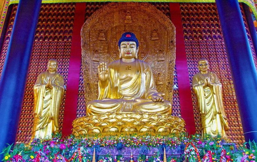 三佛──在大雄寶殿內(nèi)三尊佛像并排而坐。不論漢傳及藏傳佛教,一律都是如來(lái)相。諸佛可從手印、標(biāo)幟和座次來(lái)確認(rèn)。