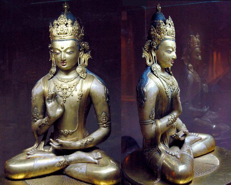 元代統(tǒng)治階級(jí)信奉藏傳佛教,但對(duì)其它宗教信仰采取寬容態(tài)度,因而傳統(tǒng)的佛教藝術(shù)仍得到繼承和發(fā)展。同時(shí),藏傳佛教密宗,與傳統(tǒng)佛教顯宗并存,使佛教造像亦有增益。“漢式造像 ”繼承了唐宋傳統(tǒng)風(fēng)格,漢化佛教特征更加明顯;“梵式造像”受到印度巴拉王朝作風(fēng)的影響,有其特定的儀軌,雖與“漢式造像”有些共同點(diǎn),但從外表形象到內(nèi)在的精神狀態(tài),從面型、體型、姿態(tài)、服飾、執(zhí)物,到背光、蓮座乃至龕形,大多顯露出梵式藏傳佛教造像的特征。到了明代,東傳的“梵式”已與“漢式”融合一起,佛教造像進(jìn)一步漢化。清代,“梵式造像”與“漢式造像”并存不悖,各領(lǐng)風(fēng)騷。特別是一些鎏金銅造像,制作精美,光彩奪目,有的還鑲嵌珍珠寶石,十分寶貴。