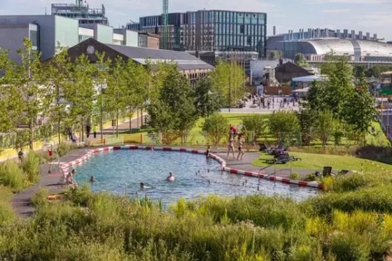 有時,設計意圖比作品顯現(xiàn)出的形式更為重要,這個公園便是如此。該裝置項目意在引導人們思考自然與變化的城市環(huán)境間的關系。在設計師們看來,當公園被圍繞在相對永久的建筑物中時,這些待開發(fā)的空間卻在持續(xù)的變化中。因此,他們在國王十字街修建了一座泳池,吸引著人們?nèi)秤巍?/p>