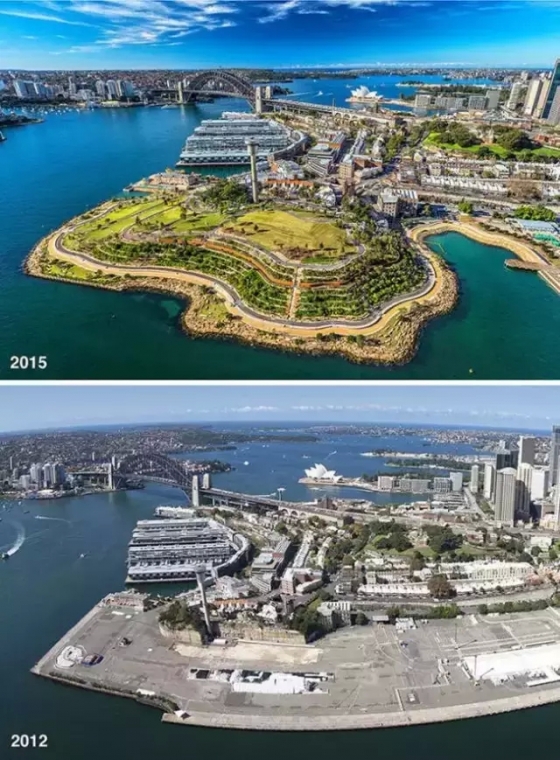 Barangaroo Headland Park修建在悉尼灣一個被人們遺忘已久的碼頭上,新建的公園將這里的歷史變遷及自然演變?nèi)诤显谝黄?并在地下修建了一個文化中心、沿著海岸線增建了人行道和自行車道,一條砂巖墻將兩者分開。此外,設計師選用了本土植物,并用相同灌木叢的反復出現(xiàn)來豐富景致。