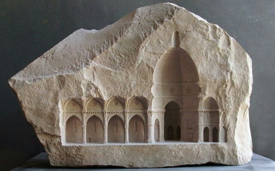 堅固的石頭內(nèi)雕刻出的建筑空間展現(xiàn)了一幅幅復(fù)雜的內(nèi)部世界圖景,變幻的視角和光線讓雕塑呈現(xiàn)出不同的面貌。