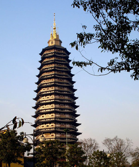 天寧寶塔乃中華第一佛塔(全球最高佛塔)位于江蘇省常州市天寧寺內(nèi)。天寧寶塔始建于2002年4月,于2007年4月30日開(kāi)光??偨娣e2.7萬(wàn)平方米,塔高13層153.79米,為國(guó)內(nèi)4000多座寶塔之最;從底層地宮到頂層鐘樓,整座寶塔以佛教文化為主線,以東陽(yáng)木雕、揚(yáng)州漆器、常州亂針繡、惠安石雕等手工藝術(shù)為表現(xiàn)手法,巧妙地詮釋了大乘佛教的諸多教義。佛塔的建成,與北方云崗大佛、中原龍門(mén)大佛、西方樂(lè)山大佛、東方靈山大佛、南方香港天壇大佛遙相呼應(yīng),成為五方五佛的佛心。
