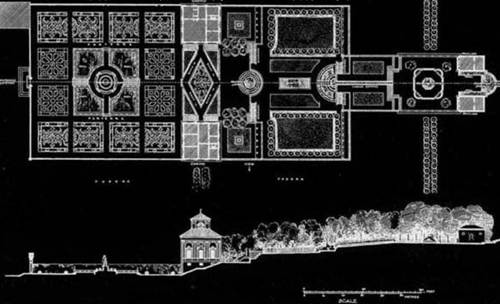 莊園四層臺地的布局均由一條中央軸線連接而成。中央軸線為一流水線,而各臺地再此軸線上都設(shè)有水景。花壇、建筑、臺階等均對稱布置在軸線兩側(cè)。在園路布置方面也順應(yīng)軸線兩側(cè)布置,再以橫向園路連接。整個園雖由圍墻封閉,但在橫向縱向均設(shè)有多個門口方便出入。由于莊園設(shè)在臺地上,所以臺階的布置尤為重要。臺階不僅僅是用于連接每層臺地,另一重要的作用是引導(dǎo)游人走向園中最美的景色中。所以每一層的臺階布置都有所不同。如連接二、三層的臺階并沒有設(shè)為縱向連接,而是設(shè)為橫向上坡,其目的是讓客人的目光轉(zhuǎn)向美麗的水景。而連接三四層的臺階也是為了將客人引向水階梯。