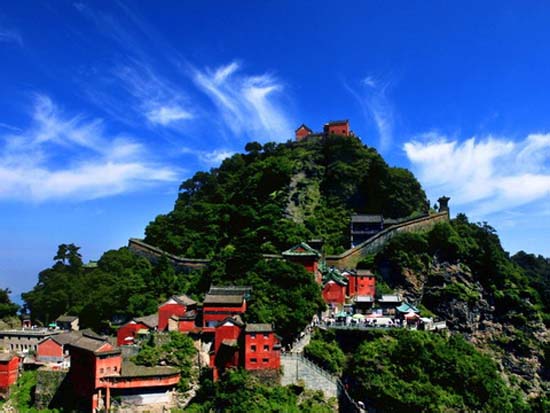 武當(dāng)山又名“太和山”,位于中國中部湖北省丹江口市的西南部。相傳為道教玄武大帝(北方神)修仙得道飛升之勝地, 歷代道教名流曾在此修煉。據(jù)記載, 唐太宗貞觀年間即在靈應(yīng)峰創(chuàng)建五龍祠。宋、元以來, 代有開拓擴建。明成祖于永樂十年(1412)曾動用軍夫30多萬人在此大興土木?,F(xiàn)存的36處宮觀大多是明代所建, 是中國現(xiàn)存最完整、規(guī)模最大、等級最高的道教古建筑群。宮觀內(nèi)保存的各類神像、法器、經(jīng)籍等都有較高的文物和藝術(shù)價值。明代(公元1368~1644年)時,武當(dāng)山被皇帝敕封為“大岳”、“玄岳”,地位在“五岳”諸山之上。武當(dāng)主峰天柱峰,海拔1612米,周圍又有“七十二峰”、“三十六巖”、“二十四澗”等勝景環(huán)繞,風(fēng)光旖旎,氣勢宏偉,被世人贊為“萬山來朝”。