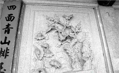 步入正門,只見大門兩旁立有兩個(gè)黑色的扁體石鼓、部分石雕等,其工藝相當(dāng)精細(xì)。正面兩邊墻壁上鑲嵌有完整的“麻雀戲梅”通花石雕,供游人觀賞、品味;抬頭望去,屋頂為穿斗式、架梁蓋瓦的硬山頂結(jié)構(gòu)。