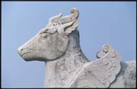 漢代墓葬手段逐漸完善之時(shí),神靈的偶像也大規(guī)模出現(xiàn),它們體現(xiàn)著人們對(duì)神的認(rèn)識(shí)、崇拜和依賴,它被認(rèn)為會(huì)給陵墓帶來吉祥,給墓主靈魂以庇護(hù)和幫助,會(huì)驅(qū)逐鬼怪邪祟。魏晉南北朝時(shí)期這種偶像化更為明顯,為后代確定了神靈崇拜的偶像模式。陵園神道兩側(cè)列置著石雕天祿辟邪;墓室里陳放著陶塑的鎮(zhèn)墓獸;壁畫描繪著羽人、飛天、神靈;墓門棺槨上也刻劃著方相氏的形象。前代的這種審美表現(xiàn)因素影響著唐陵石雕藝術(shù)表現(xiàn)的一個(gè)重要方面,即歸結(jié)出天馬、天鹿等神靈崇拜的占有一定比例的造型表現(xiàn)部分。末陵石雕的角端、瑞禽明清陵園石雕的麒麟、獬豸等都是這種基礎(chǔ)內(nèi)容模式的演變。先民們?cè)噲D通過陵墓這一特殊的環(huán)境達(dá)到人與神的有效溝通,在這個(gè)意義上造型手段起著關(guān)鍵性作用。陵墓被視為人神共處的理想化的虛幻而可信的環(huán)境,在這里天國(guó)、人間、地獄融為一體,形成完整的世界??梢哉f,對(duì)神靈的崇拜心理和原始宗教的世界觀是決定墓葬表現(xiàn)形式的重要因素。