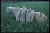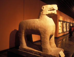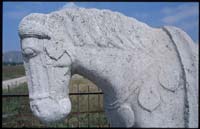 古代陵園石雕遺存實(shí)物最早的是引人注目的西漢霍去病墓石雕,作品原在陜西省興平縣漢武帝茂陵東面霍去病墓上與墓前?,F(xiàn)已發(fā)現(xiàn)的石雕作品有造型各異、天趣宛然的動(dòng)物、人物等共十四件?;羧ゲ槲鳚h名將,漢武帝為表彰其功、紀(jì)念其人,于茂陵東面選定其墓址并“為冢象祁連山”,據(jù)《史記?衛(wèi)將軍驃騎傳?索隱》記:其墓“冢上有豎石,前有石馬相對(duì),又有石人”。今存作品即記載中的部分原物。它們可以分為兩類,一是通常被稱之為“馬踏匈奴”的立馬,二是其它渚石。立馬的原在位置是墓前不遠(yuǎn),長(zhǎng)年來未有大的移動(dòng),從形式上看為靜立姿態(tài),尺度適中,符合一般早期墓前石雕的制作規(guī)律,相信此即記載中相對(duì)而立的石馬,只是另一件已無存,“石人”也不見了。唐薛逢《漢武帝祠》詩云:“茂陵煙雨埋弓箭,石馬無聲蔓草寒”。詩中所指茂陵石馬當(dāng)系帝陵制度,但與霍墓立馬的位置及造型表現(xiàn)肯定有直接關(guān)系。西漢時(shí)期陵園墓前設(shè)置石雕已成風(fēng)氣,關(guān)于石人石獸的記載與遺存并不罕見,因此霍去病墓前石馬并非例外,實(shí)屬常規(guī)設(shè)置,它為我們提供了代所完善的石象生設(shè)置與造型形式之源的現(xiàn)知最早實(shí)物證據(jù)。