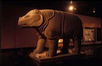 與石虎同列的石犀運(yùn)用著相似的寫實(shí)手法,它明確強(qiáng)調(diào)了犀牛的褶皺皮膚和粗重身軀,真實(shí)刻劃著對(duì)象的體征。與石虎不同的是石犀身上刻有細(xì)密的魚鱗紋;這種非寫實(shí)的線刻紋可能是顯示犀牛皮膚粗糙感的表意性處理。實(shí)際上在龐然大物表面分布的細(xì)密的魚鱗紋在拉開視距觀察時(shí)給人的視覺感受正是皮膚粗糙感。