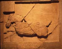 “昭陵六駿”,與其說是表現(xiàn)雕刻的美不如說是表現(xiàn)繪畫的美。據(jù)記載,昭陵是在杰出美術(shù)家閻立德主持下修建的,并由其弟閻立本圖繪十四國(guó)君長(zhǎng)像為石刻范本?,F(xiàn)存十四國(guó)君長(zhǎng)像頭部殘塊顯示的確有寫真特征,面部皺紋用線刻形式加以表現(xiàn),甚至眼角的紋路亦不放過,形象追求“寫真性”,突出個(gè)人的容顏特點(diǎn),在某種程度上帶有一定的摹刻繪畫性,不同于一般的石人?!傲E”所表現(xiàn)的是唐太宗征戰(zhàn)慣用的六匹戰(zhàn)功馬,宋游師雄題《六駿碑》中記述了石刻當(dāng)時(shí)安置的次序:颯露紫(西第一)、特勒(勤)驃(東第一)、拳毛馬咼 (西第二)、青騅(東第二)、白蹄烏(西第三)、什伐赤(東第三)。“六駿”表現(xiàn)為類似于漢畫象石刻中浮雕的形式,在方形外框中刻畫馬的側(cè)面形象,韻致非常接近于唐代繪畫中馬的表現(xiàn)?!傲E”是具體指象,即“刻石為常所乘破敵馬六匹”(《唐會(huì)要?卷二十》),有形象的特定要求,而且選擇了戰(zhàn)馬中箭、奔馳、療傷的情節(jié)并刻畫出了馬頸部的“三花紋”這類細(xì)節(jié)。這都宜于繪畫表現(xiàn)而不宜于圓雕表現(xiàn)。既然人像石雕可以繪畫為范本,馬的石雕當(dāng)然也完全可能以繪畫為范本。昭陵沒有效法圓雕形式表現(xiàn)鞍馬,原因之一就在于類似畫象石的浮雕形式更便于傳達(dá)繪畫性表現(xiàn)內(nèi)容,避免圓雕所受的材料限制,從而傳達(dá)“六駿”特有的紀(jì)實(shí)性審美意味。