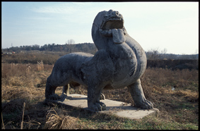 中原地區(qū)從戰(zhàn)國(guó)秦漢興起的在墓前設(shè)置石雕人物、動(dòng)物雕像的風(fēng)氣在唐代已經(jīng)波及到少數(shù)民族居住地區(qū),但由于各自不同的生存環(huán)境、文化傳統(tǒng)、生活方式及受到外來文化影響程度等原因,石雕作品的內(nèi)容與形式和中原密切聯(lián)系的同時(shí)又有明顯差異。位于吉林省敦化縣的渤海國(guó)前期王族墓地現(xiàn)存石獅兩尊,造型與中原唐陵早期作品十分相似,同時(shí)不失北方部族藝術(shù)的雄渾質(zhì)樸風(fēng)氣,顯示了中原文化的明顯滲透。
