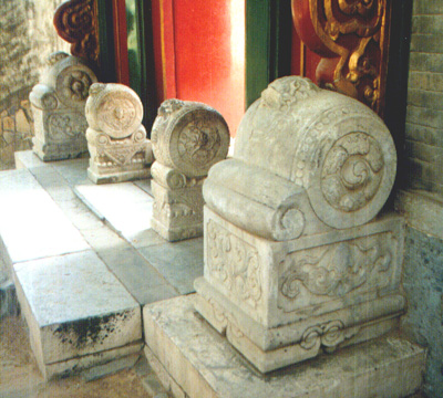 抱鼓石一般可分為兩種:一種是以徽派祠堂宅門抱鼓石為代表的樣式,稱為"螺蚌抱鼓石",多為三段:下部為基座,中部為承托件,上部為抱鼓石。整個(gè)造型不對(duì)稱,抱鼓石有向外突兀的起勢,很像一只螺或蝸牛,抱鼓石就像是其所背負(fù)的厚重外殼。 另一種是以北京四合院宅門(正門或二門)為代表的樣式,稱之為"如意抱鼓石",也可分為三段:下部雕須彌座,座上蓋有方形錦巾,中間為由兩個(gè)橫放的仿錐鼓與下部的方形錦巾組合成的如意形,上部為豎立著的圓鼓,一般鼓頂部還雕有臥獅。"如意抱鼓石"較為對(duì)稱,整個(gè)造型渾然一體,也有只剩一個(gè)仿錐鼓與方巾組成半個(gè)如意形的依柱式抱鼓石. 抱鼓石的裝飾圖案 目前遺存的抱鼓石紋樣豐富多彩,從題材上來分,可分為瑞獸祥云、花鳥蟲魚和器物什錦等等,從雕刻部位可分為鼓座、鼓面、鼓頂三大類。鼓座上多浮雕著牡丹、荷花、芙蓉、葵花以及如意紋、卷草紋、祥云紋等紋樣,表達(dá)著福壽吉祥的寓意,是花好富貴的象征;鼓面上裝飾的圖形既有低浮雕紋樣,又有高浮雕的獅子。如有螺旋曲線的裝飾紋樣,還刻有三獅戲球、四獅同堂(四世同堂),五獅護(hù)欄(五世福祿)等圖案;鼓頂上面一般也雕成獅形,有站獅、蹲獅或臥獅。獅者,獸中之王也,是舊時(shí)大戶人家盡顯豪門威嚴(yán)的象征。 "門當(dāng)戶對(duì)" 抱鼓石與門簪因?yàn)樵谡T門面上下遙相呼應(yīng),在民間有所謂的"門當(dāng)戶對(duì)"之說。門簪是戶對(duì)的一種說法。 根據(jù)建筑學(xué)上的和諧美學(xué)原理,大門前有門當(dāng)?shù)恼罕赜袘魧?duì),所以,門當(dāng)、戶對(duì)常常被同呼并稱。又因?yàn)殚T當(dāng)、戶對(duì)上往往雕刻有適合主人身份的圖案,且門當(dāng)?shù)拇笮?、戶?duì)的多少又標(biāo)志著宅第主人家財(cái)勢的大小,所以,門當(dāng)和戶對(duì)除了有鎮(zhèn)宅裝飾的作用,還是宅第主人身份、地位、家境的重要標(biāo)志。 在今天,門當(dāng)戶對(duì)逐漸演變成社會(huì)觀念中衡量男婚女嫁條件的一個(gè)成語。