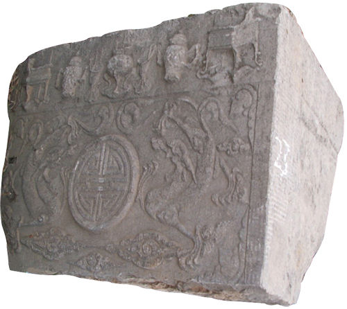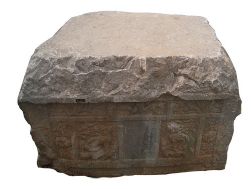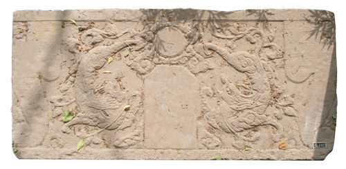 為分體式。桌裙四周刻邊框,框內(nèi)底部為海水波濤,中間有山石,即壽山福海;上部刻雙獅戲繡球。構(gòu)圖雖簡單,但布局勻稱。造型準(zhǔn)確而動感強(qiáng),突出了獅子的威猛。上有紀(jì)年款銘:嘉慶十九年(1814年)。