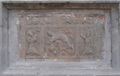 為分體式。裙面分為3個方框,中間大框內(nèi)雕屋外古樹下影壁前,一官人模樣者向站立的一老婦人跪拜,老婦人身著寬袖衣,下著長裙,手持拐杖,站立門前,此當(dāng)為急于見老母的孝子朱壽昌,即畫面表現(xiàn)的是“二十四孝”之一的“棄官尋母”。從雕刻手法看,其為清代中后期作品。