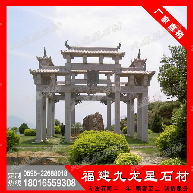 花崗巖石雕牌坊按照開門數(shù)一般可分為三門、五門、七門。草白玉、青石、漢白玉以及花崗巖這些石材成為制作石雕牌坊的主要石材。牌坊周身布滿浮雕圖案,雕刻工藝精 美細(xì)膩。常見的瑞獸圖案有龍、鳳、麒麟、鹿(諧“祿”)、魚(諧“余”)等。另外有荷花、牡丹、松鶴、梅蘭竹菊代表著健康長壽、平安幸福?;◢弾r石雕牌坊頂部的結(jié)構(gòu)造型主要有坊式和樓式兩種,樓式結(jié)構(gòu)的頂部結(jié)構(gòu)復(fù)雜,斗拱以及樓瓦的配合使得整體氣勢恢宏。坊式結(jié)構(gòu)頂部則沒有了斗拱、樓瓦這些構(gòu)件,顯得簡單大方。