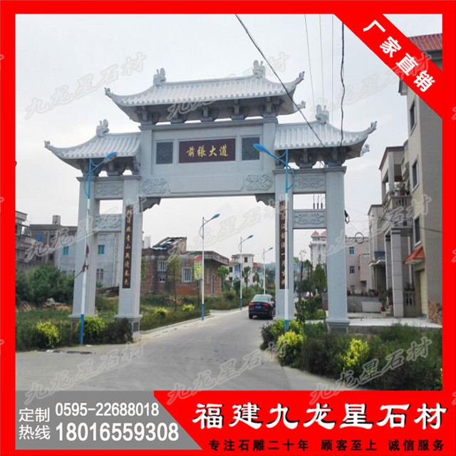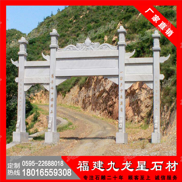 石雕牌坊的原料主要有漢白玉、青石、花崗巖等。我們知道如北京明代陵墓外面的大紅門石雕牌坊前,有石牌坊一座。整個牌坊為五間六柱十一樓,結(jié)構(gòu)是勻稱和諧的,而且造型美觀大方。牌坊用純一色的漢白玉石材雕刻而成。柱石的上方刻有麒麟、石 獅子,夾柱石的浮雕有雙獅戲彩珠,牌坊的雕刻怪獸云紋。是我國建筑藝術(shù)的一大特色。接下來說說花崗巖石雕牌坊: