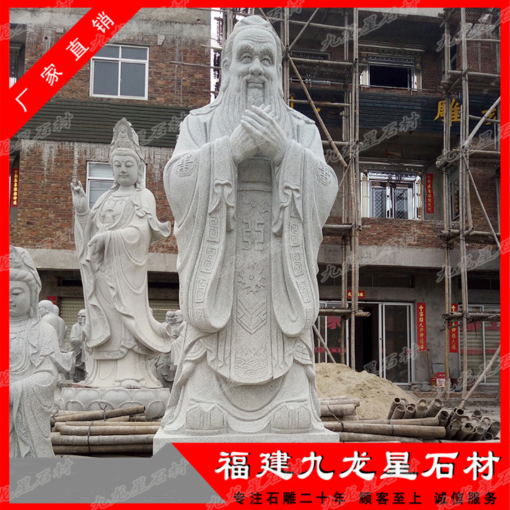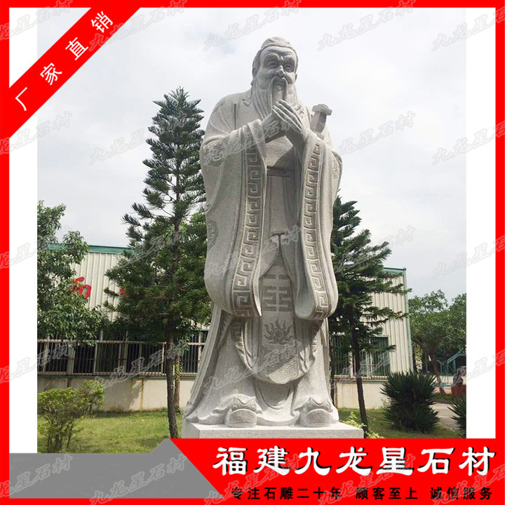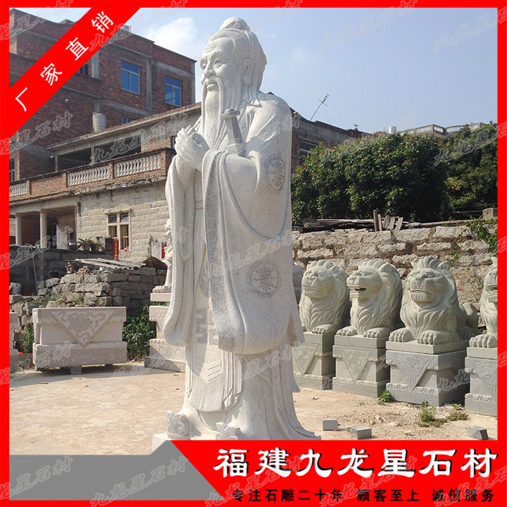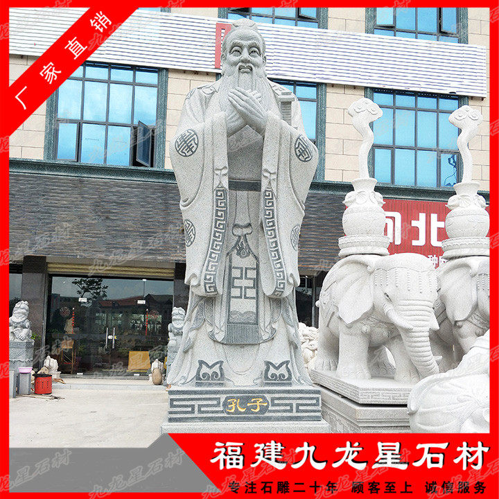 孔子石雕像樣式選擇性不算太大,現(xiàn)在我們看到的孔子形象大多是根據(jù)唐朝的吳道子所畫的孔子像來進行創(chuàng)作雕刻的,長眉長須,身著寬大的儒服,衣袂飄飄,栩栩如生,因此非??简灥窨處煾档墓に嚕_到石雕像的真實感,表情惟妙惟肖。一般比較常見的孔子石雕像有比較簡單的頭像,也有站姿的石雕像,基本上站立姿勢的石雕像選擇性更受到人們喜愛,有手里握著書卷拿在胸前,一手背在身后,抬頭挺胸,眼神眺望的石像,也有將雙手交叉并在胸前,但是我們可以看到交疊的手是不露出大拇指的,象征著謙恭有禮,而四指并攏,也代表著四海之內(nèi)皆兄弟,有著友愛、友誼的象征意義。