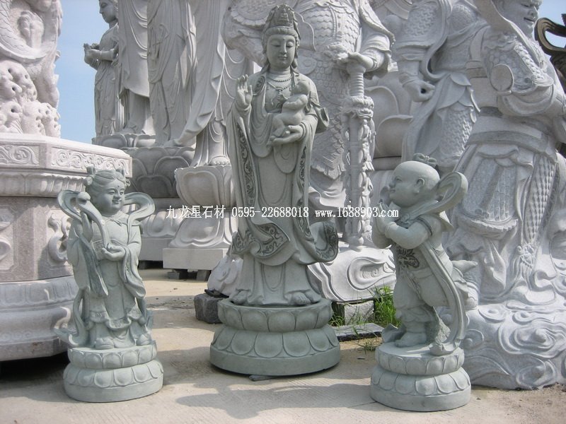 此尊石雕送子觀音造像,含蓮花底座高2.26米。其左手邊為善財(cái)童,左手邊為龍女。