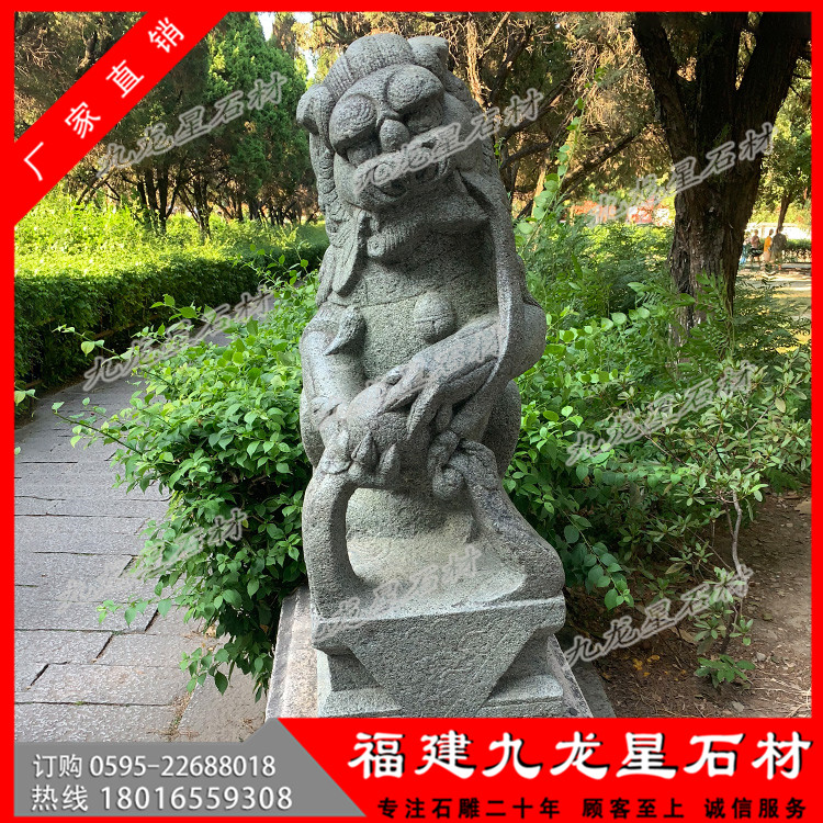 石雕獅子大體是漢族傳統(tǒng)文化中常見的辟邪物品之一。宮廷石獅一般置于宮殿、陵墓前,在形體力度和內(nèi)在精神氣勢(shì)上氣吞山河、威猛雄壯;宗教石獅多出現(xiàn)于佛教寺廟石窟之中,其形象對(duì)之后中國石獅造型的演變產(chǎn)生很大影響;民間石獅最普及也最有生命力,百姓把獅子看成能驅(qū)惡辟邪的瑞獸,因此,在民間數(shù)量最多的是牌坊門墩獅和鎮(zhèn)宅獅,此外,還有拴娃獅、壓繃獅、印紐獅等等。造型的隨意性和夸張性是民間獅子形象的一個(gè)突出點(diǎn),格調(diào)清新,情趣盎然,并運(yùn)用象征、會(huì)意、諧音等手法來創(chuàng)作石獅形象,賦予了喜慶吉祥色彩,充滿著濃郁的生活氣息。