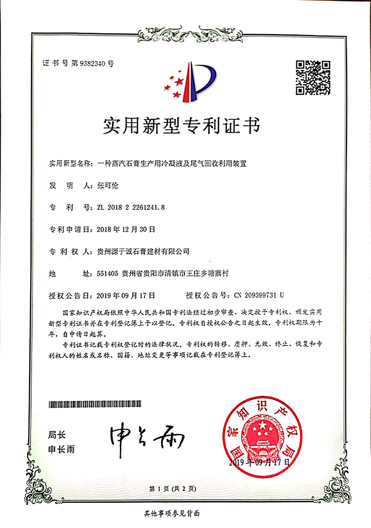 專利證書(一種蒸汽石膏生產(chǎn)用冷凝液及尾氣回收