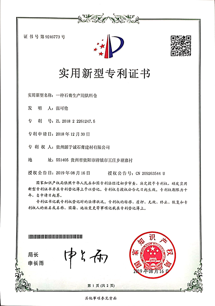 專利證書(一種石膏生產(chǎn)用烘料倉)